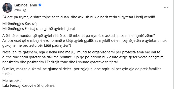 Këngëtari i njohur Labinot Tahiri ka reaguar ashpër ndaj ndërprerjes së furnizimit me energji elektrike në Ferizaj dhe qytete të tjera, duke kritikuar heshtjen e qytetarëve dhe institucioneve përballë asaj që ai e quan “nënçmim dhe poshtërim të qytetarëve”.