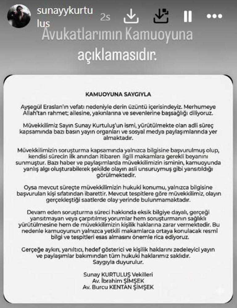 Kjo deklaratë e tij lë pikëpyetje të mëdha, mirëpo, edhe avokatët e aktorit kanë çuar dëshmi të mjaftueshme që Sunay nuk ka të bëj asgjë me vdekjen e modeles.