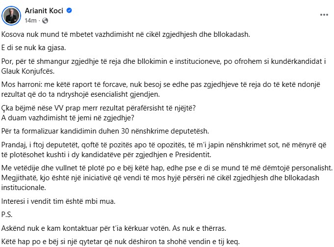 Koci ka thënë se për të shmangur zgjedhjet e reja dhe bllokimin e institucioneve, ofrohet si kundërkandidat i Konjufcës, përkundër se e di se nuk ka gjasa.