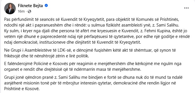 “Ky sulm, i kryer nga djali dhe persona të afërt me kryesuesin e Kuvendit, z. Fehmi Kupina, është jo vetëm një dhunë e paprecedentë ndaj një përfaqësuesi të qytetarëve, por edhe një goditje e rëndë ndaj demokracisë, institucioneve dhe dinjitetit të Kuvendit të Kryeqytetit” tha ajo.