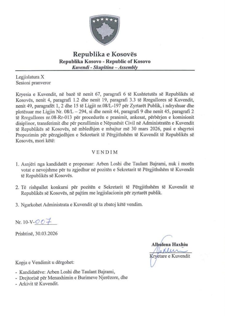 “Asnjëri nga kandidatët e propozuar, Arben Loshi dhe Tualant Bajrami nuk i morën votat e nevojshme për t’u zgjedhur në pozitën e Sekretarit të Kuvendit të Republikës së Kosovës.”, thuhet në vendimin e Kuvendit, të cilin e ka nënshkruar kryeparlamentarja, Albulena Haxhiu.