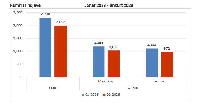 Në muajin shkurt 2026 janë regjistruar 2 mijë e 2 lindje (brenda dhe jashtë Kosovës). Prej këtyre lindjeve të regjistruara 1 mijë 30 lindje janë meshkuj dhe 972 lindje janë femra.