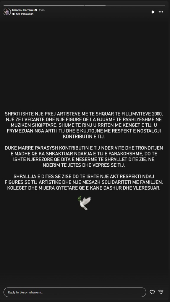 Përmes një postimi në llogarinë e tij në Instagram, Blero ka shprehur dhimbjen e thellë, duke e cilësuar Shpatin si një “figurë që la gjurmë të pashlyeshme”.