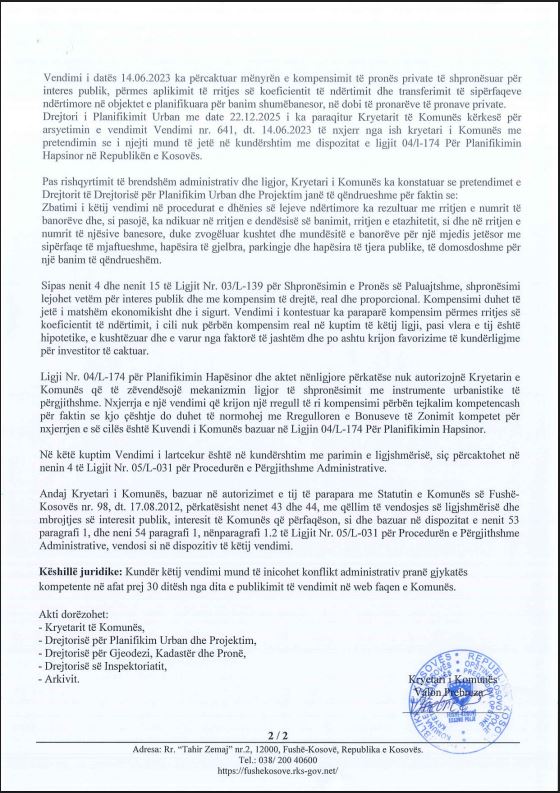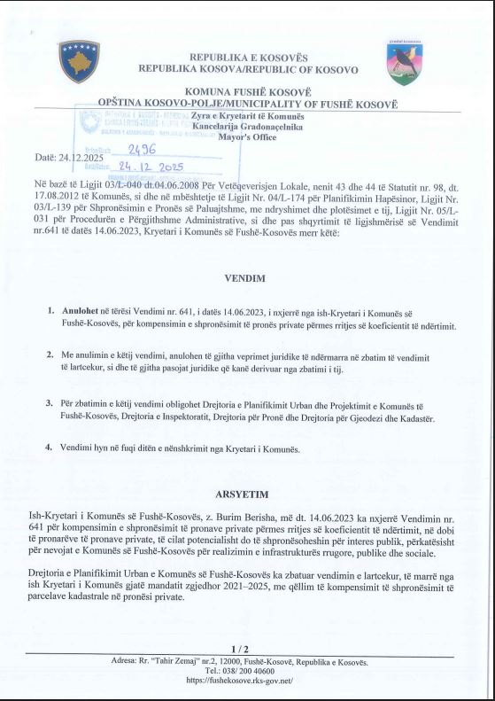 Sipas dokumenteve zyrtare, fillimisht është anuluar në tërësi Vendimi nr. 641 i datës 14.06.2023, që kishte të bënte me kompensimin e shpronësimit përmes rritjes së koeficientit të ndërtimit.