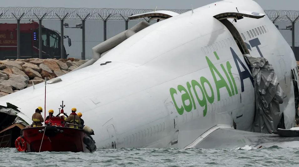 Një avion mallrash Boeing 747 rrëshqiti nga pista dhe u rrëzua në det në Aeroportin Ndërkombëtar të Hong Kongut të hënën në mëngjes, duke vrarë dy punonjës të sigurisë së aeroportit, automjeti