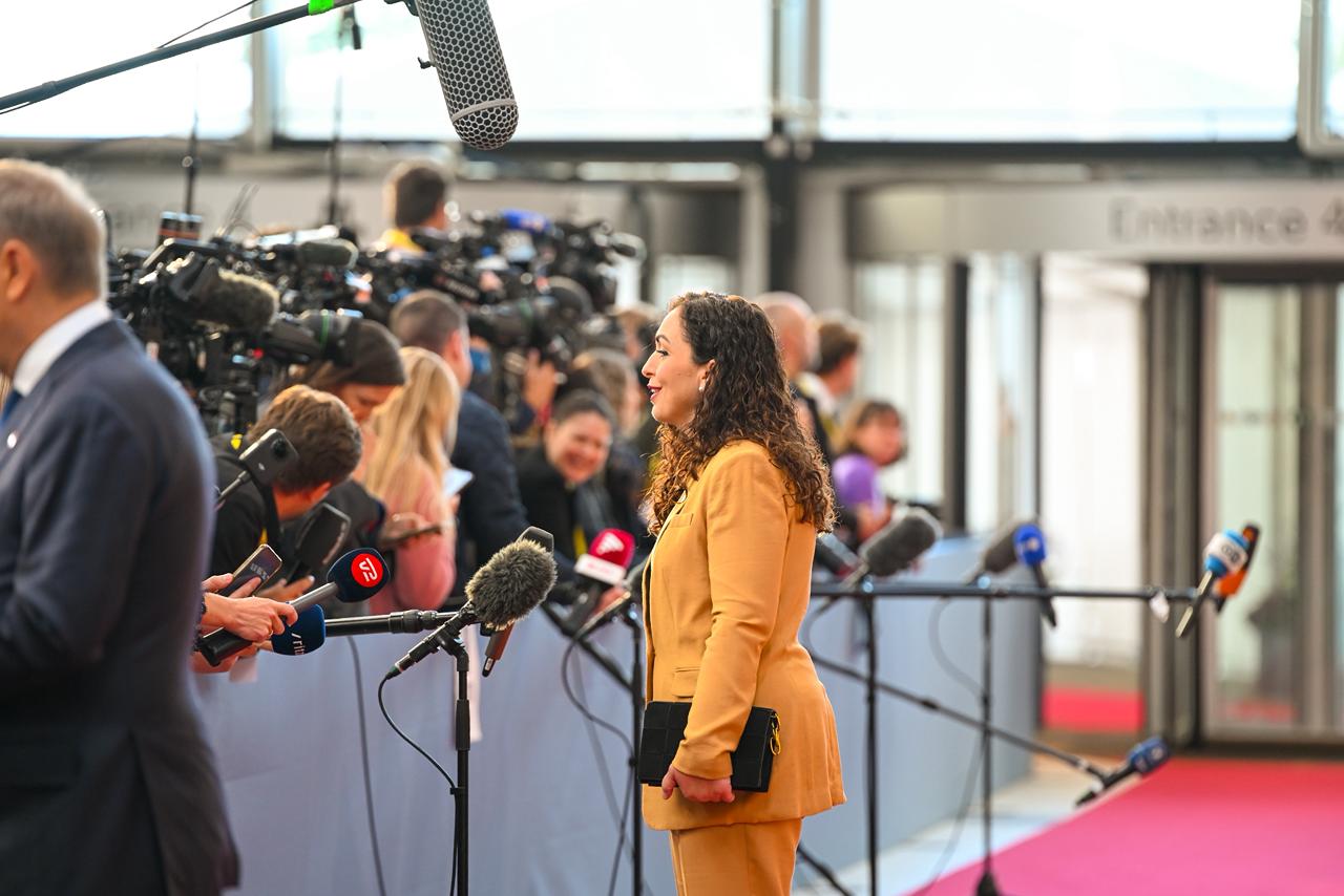 Presidentja Vjosa Osmani po merr pjesë në Komunitetin Politik Europian që po mbahet sivjet në Kopenhagë. Para se të nisin punimet e takimet, Osmani u ndal te shtypi për pyetjet e tyre.