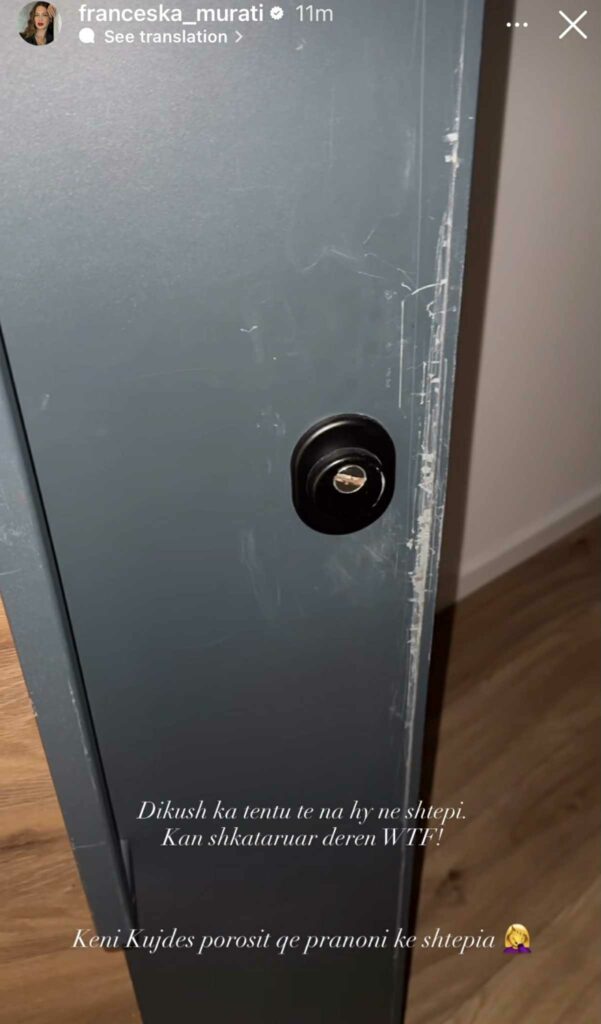 “Dikush ka tentu të na hynte në shtëpi, kanë shkatërruar derën”, ka shkruar ajo krahas kësaj fotografie, të publikuar në llogarinë e saj në Instagram.