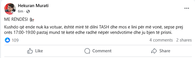 “ME RËNDËSI. Kushdo që ende nuk ka votuar, është mirë të dilni TASH dhe mos e lini për më vonë, sepse prej orës 17:00-19:00 pastaj mund të ketë edhe radhë nëpër vendvotime dhe ju bjen të prisni”, shkroi Murati.