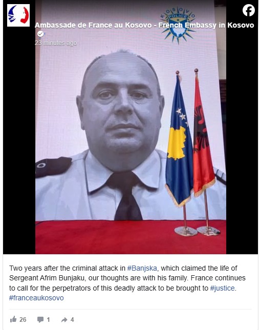 “Dy vjet pas sulmit kriminal në Banjska, që ia mori jetën rreshterit Afrim Bunjakut, mendimet tona janë me familjen e tij. Franca vazhdon të bëjë thirrje që autorët e këtij sulmi vdekjeprurës të sillen para drejtësisë”, thuhet në postim.