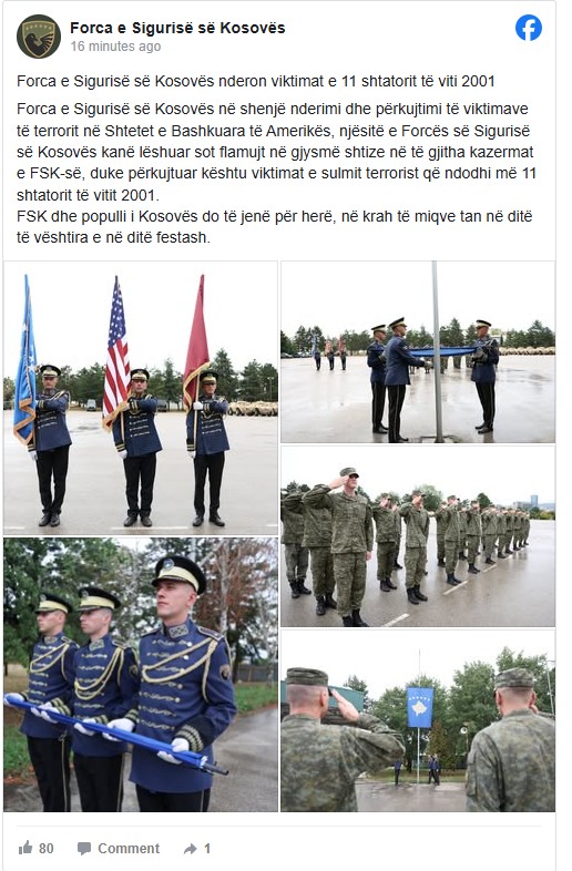 Në shenjë përkujtimi, njësitë e FSK-së kanë njoftuar se kanë ulur flamujt në gjysmë shtize në të gjitha kazermat, duke kujtuar kështu tragjedinë që tronditi botën 24 vite më parë.