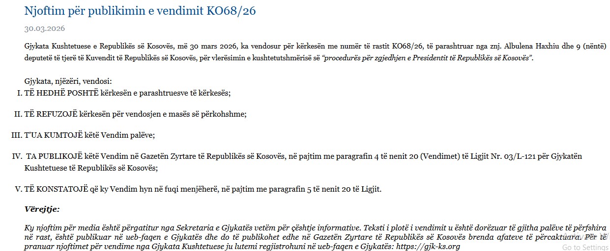 Sipas njoftimit zyrtar, teksti i plotë i vendimit tashmë u është dorëzuar palëve dhe është publikuar në faqen zyrtare të Gjykatës.