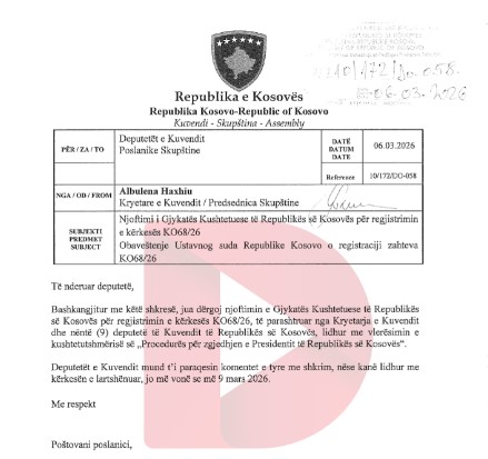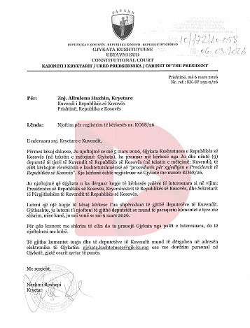 Po ashtu, ajo ju deputetëve iu ka bashkëngjit edhe regjistrimin e kërkesës me numër K.068/26 të Gjykatës Kushtetuese të bërë nga Kryetarja e Kuvendit dhe nëntë (9) deputetë të Kuvendit të Republikës së Kosovës lidhur me vlerësimin e kushtetutshmërisë së ,,Procedurës për zgjedhjen e Presidentit të Republikës së Kosovës.