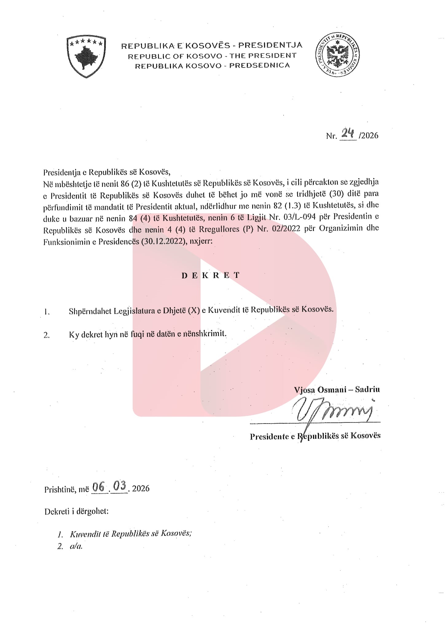 Kryetarja e Kuvendit të Republikës së Kosovës, Albulena Haxhiu, i ka njoftuar deputetët për dekretin e Presidentes së Republikës së Kosovës, Vjosa Osmani, për shpërbërjen e Legjislaturës së Dhjetë dhe hyrjen në fuqi me rastin e nënshkrimit të tij.