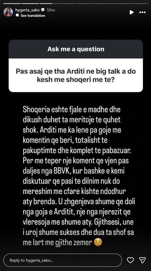 Hygerta shtoi se komenti i Arditit ka ardhur pas daljes nga BBVK, ndonëse sipas saj, ata kishin diskutuar që jashtë shtëpisë të mos merreshin më me çfarë kishte ndodhur brenda.