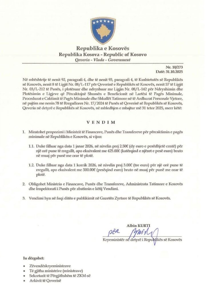 Sipas vendimit zyrtar me numër 10/273, të datës 31 tetor 2025, i nënshkruar nga kryeministri në detyrë Albin Kurti, paga minimale do të jetë: 425 euro bruto duke filluar nga 1 janari 2026, për një punë të rregullt me orar të plotë dhe 500 euro bruto, duke filluar nga 1 korriku 2026, po ashtu për punë të rregullt me orar të plotë.
