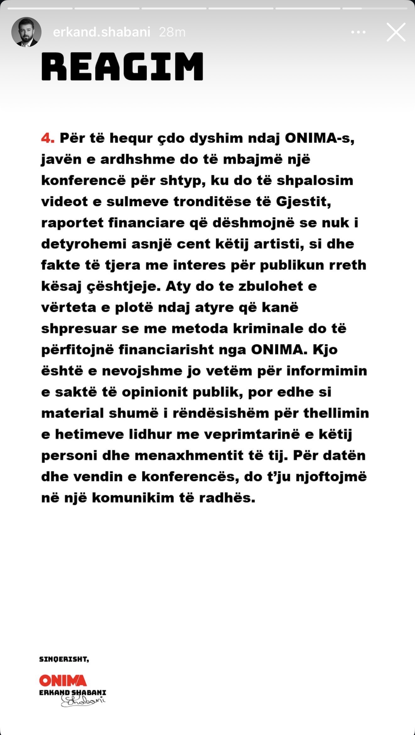 Shabani është deklaruar i vendosur, siç shprehet “për të nxjerrë zbuluar ata persona që kanë shpresuar të përfitojnë financiarisht nga ONIMA përmes metodave kriminale”. Sipas tij, publikimi i këtyre materialeve është i domosdoshëm jo vetëm për të informuar saktë opinionin publik, por edhe për t’i shërbyer thellimit të hetimeve lidhur me veprimtarinë e artistit dhe menaxhmentit të tij.