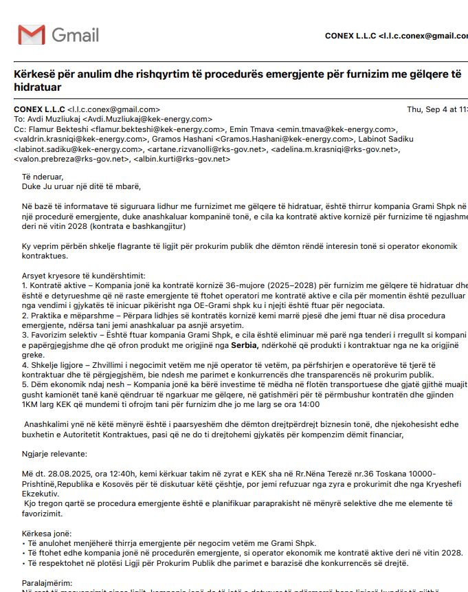 Kompania “CONEX L.L.C”, e cila kishte kontratë aktive për furnizim për këto parregullsi i ka dërguar ankesën edhe kryeministrit.