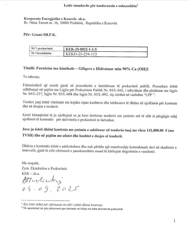 Prokurimi i Korporatës Energjetike të Kosovës (KEK sh.a.) më datë 4 shtator 2025 ka shpallur fituese kompaninë GRAMI sh.p.k. në një procedurë të negociuar për furnizim me Gëlqere të Hidratizuar, në vlerë prej 141 mijë euro (me TVSH).