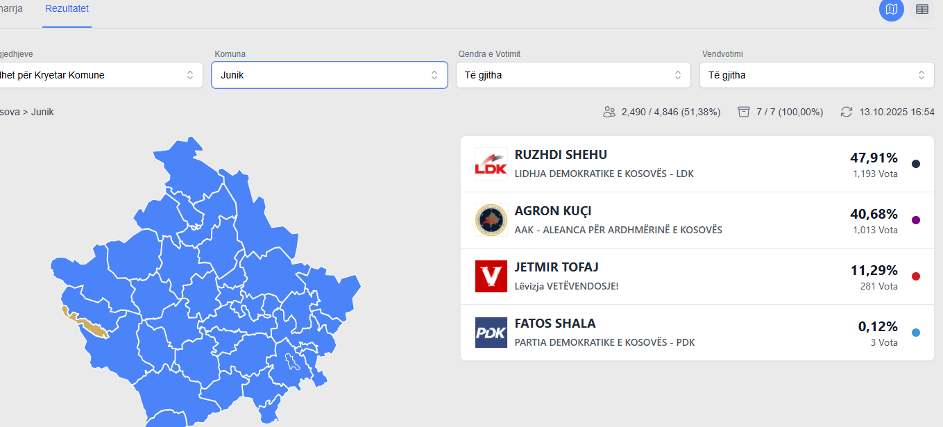Sipas rezultateve në faqen e KQZ-së, Ruzhdi Shehu i LDK-së ka fituar 47,91 të votave apo 1 mijë e 193 vota, derisa kandidati i AAK-së është i dyti me 40.68% apo 1 mijë e 13 vota.