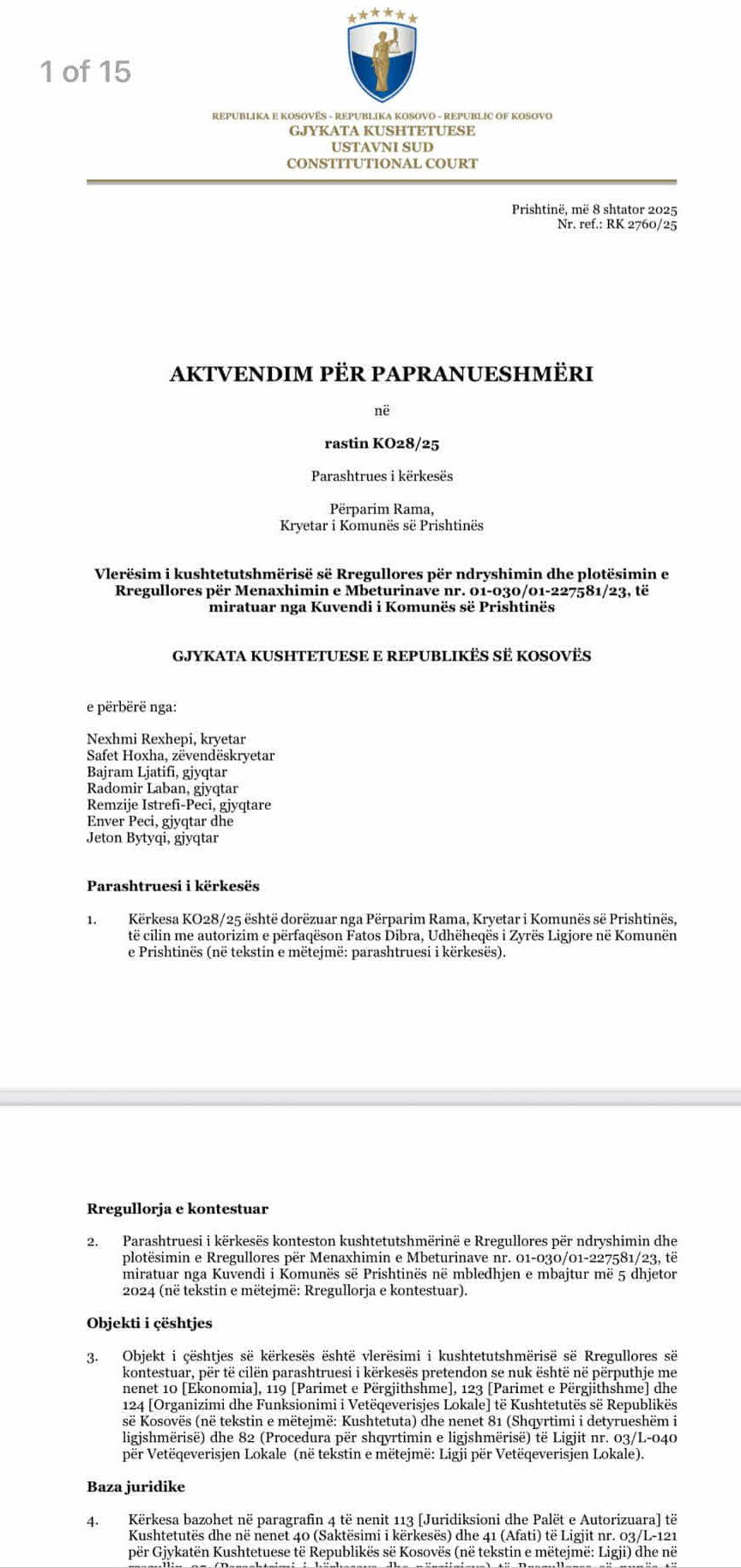 Gjykata Kushtetuese ka shpallur të papranueshme ankesën e kryetarit të Prishtinës, Përparim Rama, kundër rregullores së mbeturinave të miratuar më 5 dhjetor 2024 nga Kuvendi Komunal.
