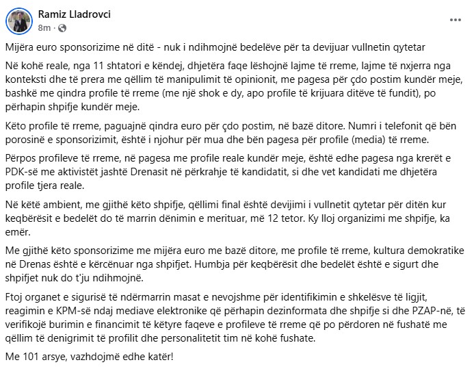 “Përpos profileve të rreme, në pagesa me profile reale kundër meje, është edhe pagesa nga krerët e PDK-së me aktivistët jashtë Drenasit në përkrahje të kandidatit, si dhe vet kandidati me dhjetëra profile tjera reale.