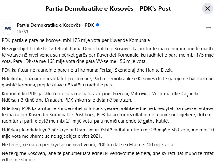 Partia Demokratike e Kosovës thotë se doli “partia e parë në Kosovë, me mbi 175 mijë vota për Kuvende Komunale”.