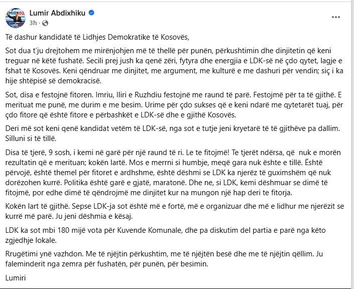 “Kokën lart të gjithë. Sepse LDK-ja sot është më e fortë, më e organizuar dhe më e lidhur me njerëzit se kurrë më parë. Ju jeni dëshmia e kësaj. LDK ka sot mbi 180 mijë vota për Kuvende Komunale, dhe pa diskutim del partia e parë nga këto zgjedhje lokale”, shkroi ai ndër tjerash në një postim të sotëm në Facebook.