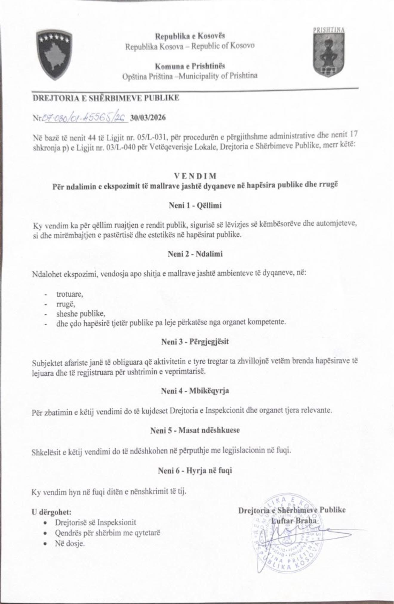 Perparim Rama, kryetar i Prishtinës, ka njoftuar se është marrë vendim që ‘’nuk ka më mallra në trotuare, bllokim të rrugëve, nuk ka më zënie të hapësirave që u takojnë të gjithëve’’.