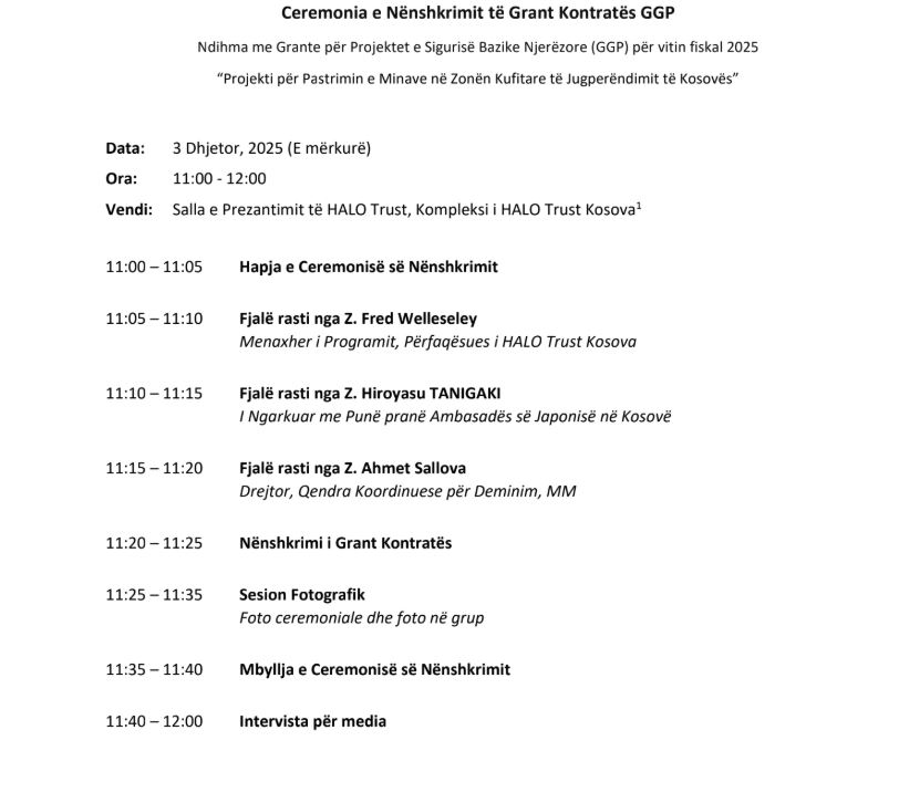 Ambasada e Japonisë në Kosovë ka njoftuar se të mërkurën , 3 dhjetor, do të nënshkruhet Grant Kontrata ndërmjet ambasadës japoneze dhe HALO Trust Kosovo,për projektin “Projekti për Pastrimin e Minave në Zonën Kufitare të Jugperëndimit të Kosovës”.