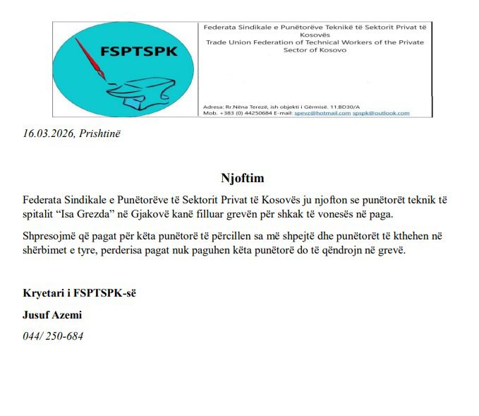 Federata Sindikale e Punëtorëve të Sektorit Privat të Kosovës ka njoftuar se greva ka filluar pasi punëtorët nuk i kanë marrë pagat me kohë.
