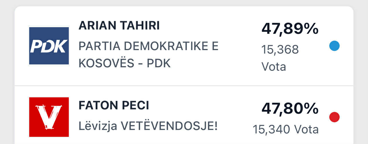 Fillimisht nga Exit Poll-et Arian Tahiri u shpall fitues, mirëpo, sipas rezultateve të KQZ-së, Tahiri dhe Peci janë në balotazh me 20-30 vota diferencë.