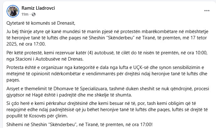 “Për këtë protestë, kemi rezervuar katër (4) autobusë, të cilët do të nisën të premtën, në ora 10:00, nga Stacioni i Autobusëve në Drenas.