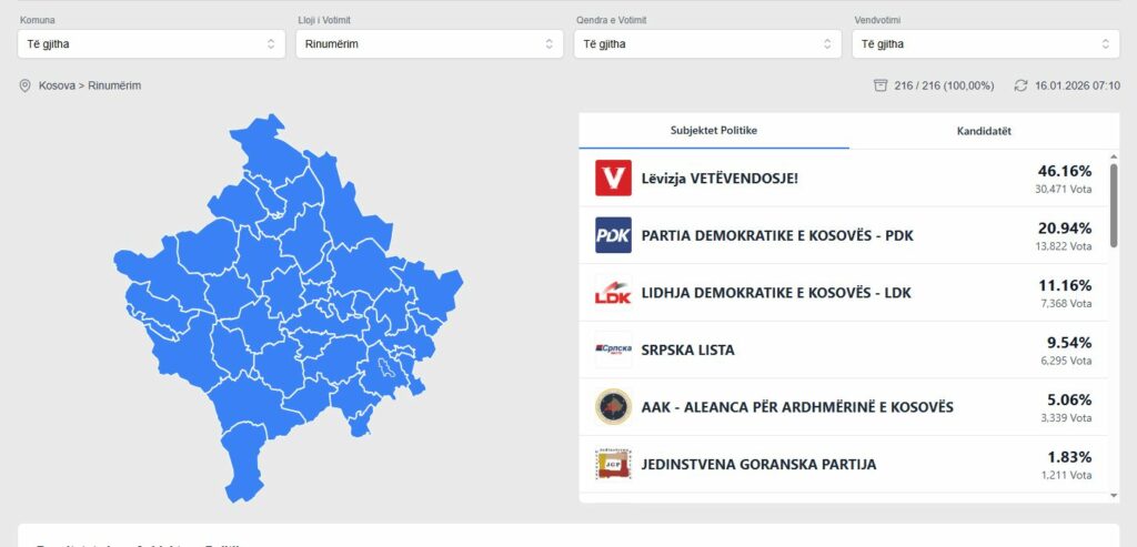 Nga rezultatet e deritanishme prin VV-ja me 46.16%, duke u pasuar nga PDK 20.94% e LDK e treta me 11.16% dhe AAK ka marr 5.06%.