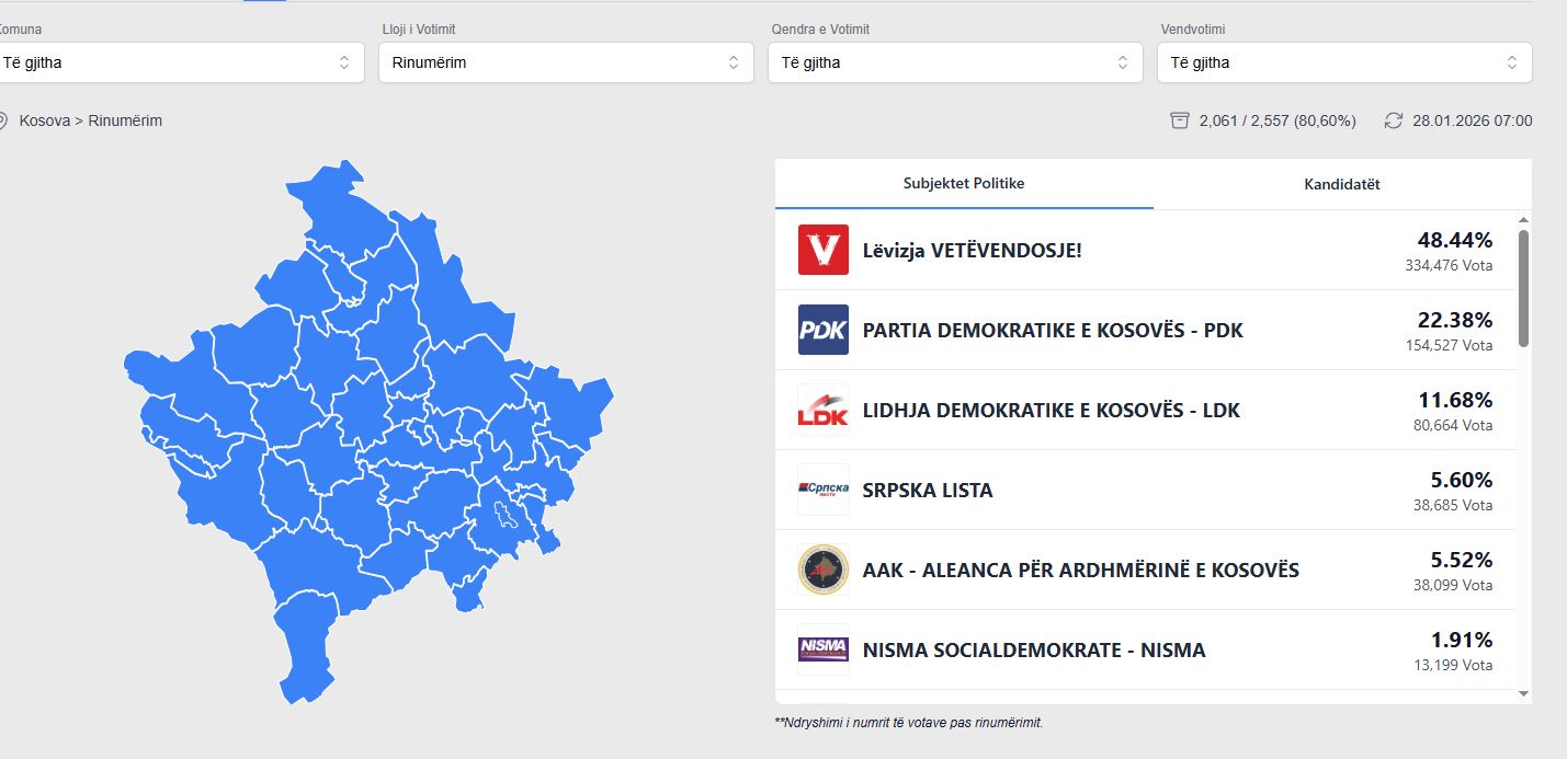 Deri në orën 07:00 të mëngjesit të së mërkurës, janë rinumëruar gjithsej 80.60% e votave, apo 2.061 nga 2557 vendvotime.