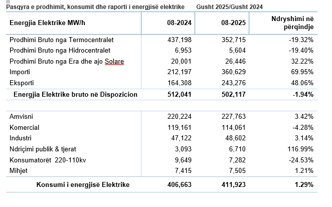 ASK njofton po ashtu se importi i energjisë elektrike në gusht të vitit 2025 ishte 360.623 GWh, ndërsa në periudhën e njëjtë të vitit të kaluar, importi ishte 212,197 GWh ose 148. 432 GWh më shumë.