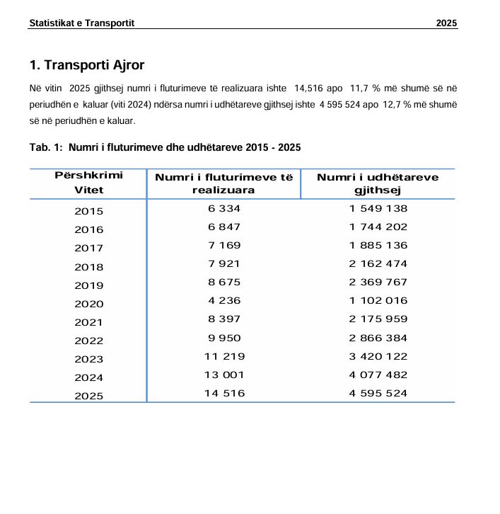 “Në vitin 2025 gjithsej numri i fluturimeve të realizuara ishte 14,516 apo 11,7 % më shumë së në periudhën e kaluar (viti 2024) ndërsa numri i udhëtareve gjithsej ishte 4 595 524 apo 12,7 % më shumë së në periudhën e kaluar”, thuhet në raportin e ASK-së.