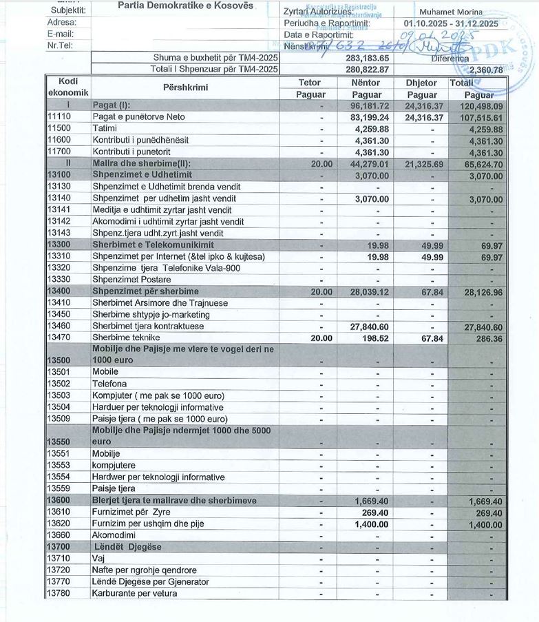 Sipas të dhënave zyrtare, Partia Demokratike e Kosovës (PDK) gjatë tremujorit të katërt të vitit 2025 ka shpenzuar gjithsej 280 mijë e 822 euro.