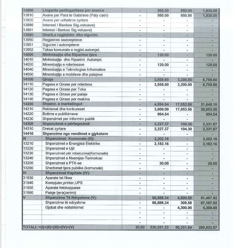 Nga ky total, 120 mijë e 498 euro janë shpenzuar për paga, ndërsa 65 mijë e 624 euro janë shpenzuar për mallra dhe shërbime.