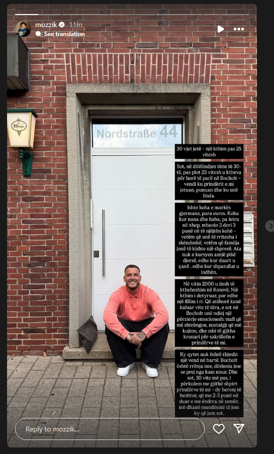 Në postimin e tij, Mozzik kujton sakrificat e prindërve që punuan deri në tri punë njëkohësisht, për t’i ofruar familjes një jetë më të mirë. Ai shprehet se rikthimi pas 25 vjetësh i solli ndjenja të përziera mes mallit, nostalgjisë dhe krenarisë.