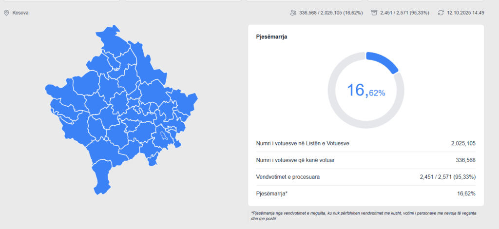 E përkthyer në përqindje, pjesëmarrja në zgjedhje në përditësimin e fundit (14:49), është 16.62%.
