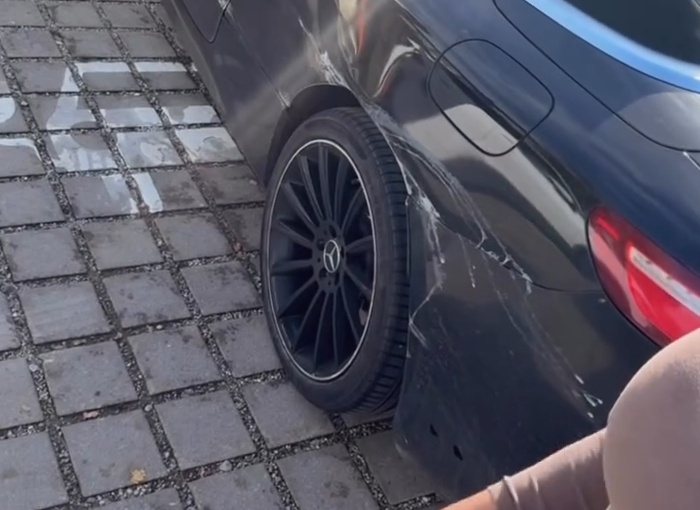 Në video, ajo duket e buzëqeshur dhe e lumtur që ka shpëtuar,ndërkaq vetura e saj shihet mjaft e dëmtuar në njërën anë.